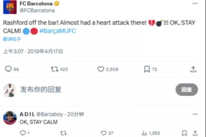 有球迷翻到19年4月17日欧冠巴萨vs曼联时,巴萨官方推特的一条推文:“拉什福德击中横梁!差点心脏病发作!好吧,冷静!”球迷今日跟上评论:“好吧,冷静!”